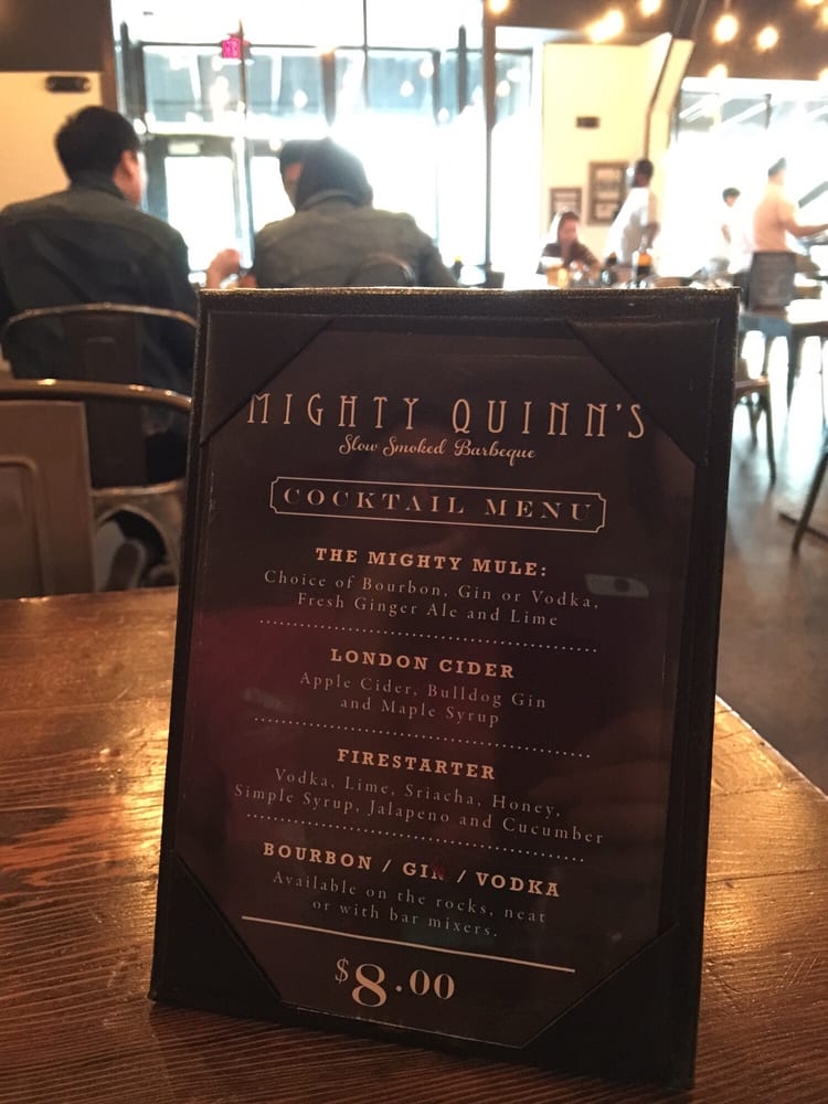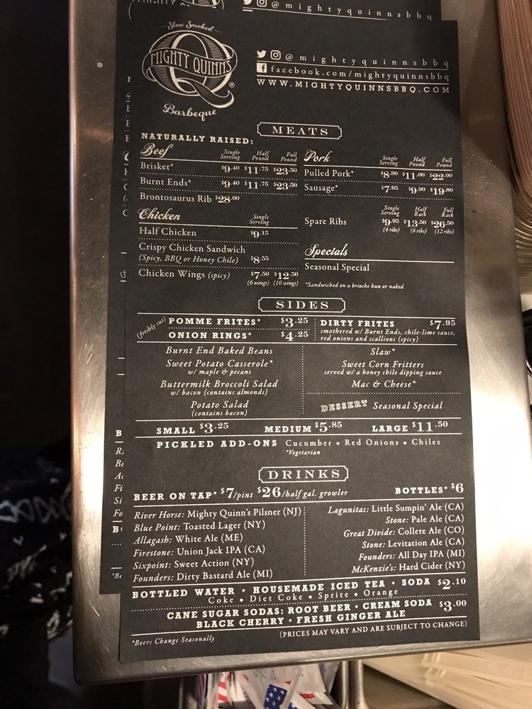 Mighty Quinn’s Barbeque, located in Clifton, NJ, offers a casual dining experience with a variety of barbeque options. The menu includes seasonal specials like the Loaded Potato with brisket or pulled pork, as well as delicious sandwiches such as the slow-smoked Brisket Sandwich and the hand-pulled Pulled Pork Sandwich. The Meats section offers sampler platters with your choice of 2 or 3 meats, including St. Louis style Spare Ribs and BBQ Wings. The restaurant also provides vegan and vegetarian options, making it suitable for a diverse group of diners. With amenities like private lot parking, a full bar, and waiter service, Mighty Quinn’s Barbeque is ideal for gatherings of any size. Overall, the menu at Mighty Quinn’s Barbeque promises a flavorful and satisfying dining experience for both meat enthusiasts and plant-based eaters alike.